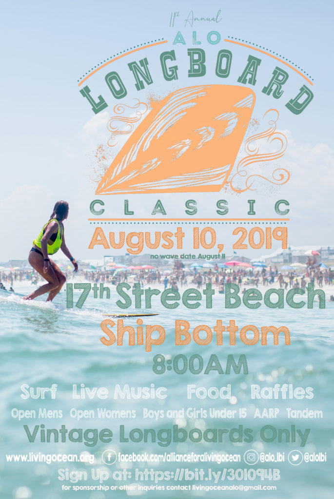 The Alliance for a Living Ocean is pleased to announce the 11th Annual LBI Longboard Classic will take place on Long Beach Island on August 10, 2019. The LBI Longboard Classic will be held at the 17th Street Beach area in Ship Bottom, NJ 08008 The event is named the “Classic” because only vintage longboards will be allowed, and the contestants will be scored by classic contest criteria such as noserides, hanging ten, cheater fives, dropknee turns, fin first takeoffs,…