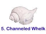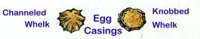 This shell is easily recognizable by its deep spiral channels. Its size varies from three to seven inches. It is pear-shaped with five to six whorls, each with a deep channel at the spiral seam. Outside it is creamy-gray while inside its colors vary from yellow to an orange-brown. It ranges from Cape Cod to northern Florida. Its string of egg capsules looks very similar to the ones of the knobbed whelk. The knobbed whelk is the largest whelk (up to nine inches) with distinctive knobs on the whorls. To tell the egg capsules apart, you must look at the disks very carefully. The capsules of the knobbed whelk have flat edges while the channel whelk's capsules have sharp edges. Since the picture of the capsules is small, you are right if you said either Knobbed or Channeled.