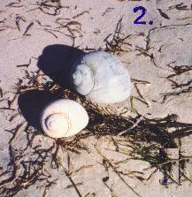 The shells of the moon snail can be found all along the Atlantic coast beaches along with the clam, mussel and scallop shells. Its sturdy shell does not break easily. It is almost round, and is from one to five inches in size. The shell is smooth and varies in color from grayish-white to brownish-gray. The interior of the shell contains tints of rose and purple. The sand collar egg mass it produces can be bigger than the parent.