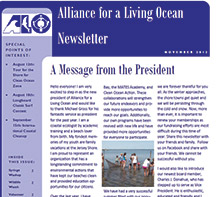 Alliance for a Living Ocean was created in 1987 to put an end to ocean dumping. Since that time, ALO has continued efforts to stop pollution and protect our coastal environment. Through the dedicated work of our volunteers, ALO strives to keep our oceans, beaches, and bays clean. Join us in helping to promote and maintain clean water and a healthy coastal environment through education and action.